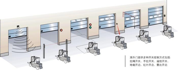 小型中型大型具有彈簧平衡系統(tǒng)的分節(jié)滑升門系列 每臺電機配備一根手動鏈條。在停電的情況下,拉動手動鏈條能使門體開啟。每臺電機配備一個控制盒,三鍵開關(guān),按動按鈕,也能開啟門體。